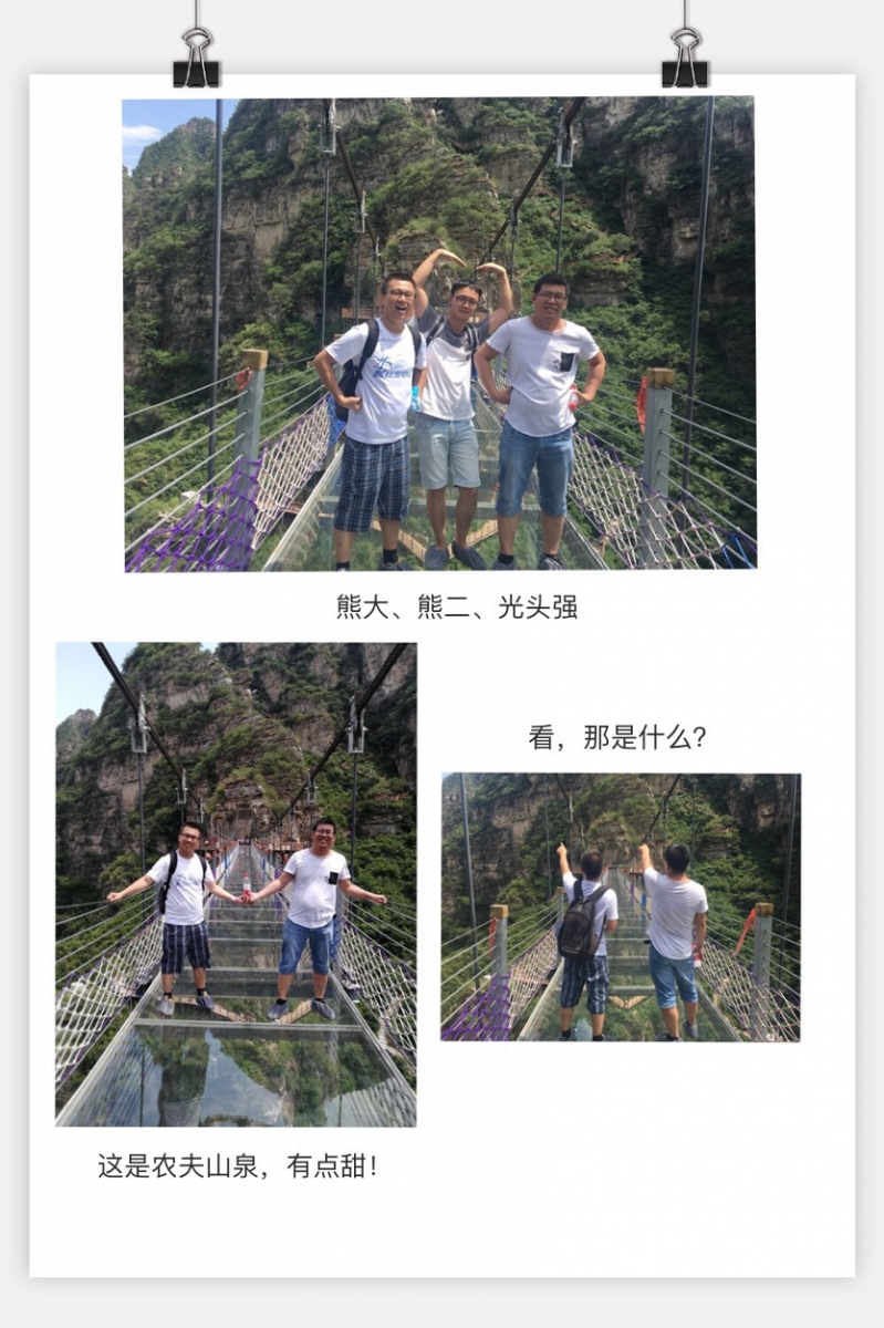 一路登险峰,踏栈道,过吊桥,即使天气炎热却依然热情不减,不亦乐乎,当踏上最高处的那一刻,顿觉远离了城市的喧嚣,只想尽情感受大自然的魅力。