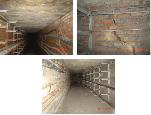 (1)两侧墙体裂缝:a、裂缝①在高低差处,下部第一步台阶位置,此处整体下降20mm左右,两边墙体裂缝宽度3-8mm。b、裂缝②在热力管道部位上部,高差大约80mm处,墙体两侧对称各有一条45°角方向的斜裂缝,缝宽3-10mm,下宽上窄,长度从顶板至底板。c、裂缝③在距井口大约4m处,墙体两侧对称部位各出现一条45°角方向的斜裂缝,缝宽5-20mm,上宽下窄,长度从顶板至底板。裂缝附近底板泥土有明显水流痕迹,底板也有明显修补痕迹。