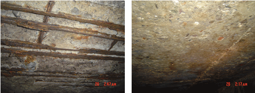 (2)预制顶板:在台阶以上C-D段部分,顶板钢筋锈蚀严重,部分地方钢筋锈蚀只剩5mm,混凝土保护层基本全部剥落,混凝土碳化深度20mm左右。台阶下部顶板混凝土碳化深度7-10mm。
