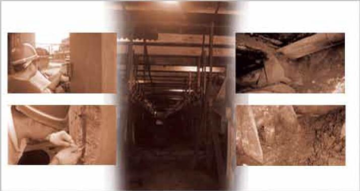 建筑经受高温辐射,构件表层严重碳化。钢筋和砼弹性模量不同,膨胀变形界面错位,引起剪切应力下降,造成安全隐患。务必突破传统束缚、改变传力途径、微观划区分析、宏观体外补强、增设过渡措施。