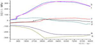图9为计算所得不同部位处钢筋应力的变化过程,2 点位于梁跨中底部,1、3 点位于梁柱节点上部,6 点位于中柱上部,7 点位于边柱外侧,4、5 点位于柱根部。