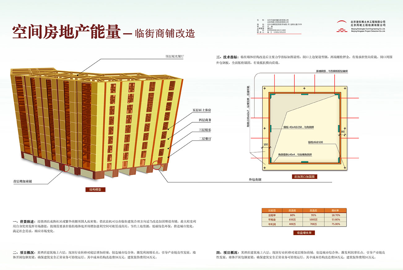一、背景陈述:连锁酒店成熟社区或繁华商圈周围人流密集,借此良机可以在临街建筑合理方向适当改造加固增设商铺,最大程度利用自身优势发挥市场潜能,按规范要求在临街墙体处开洞增加盈利空间可租赁或商用。节约土地资源,低碳绿色环保,推进城市优化,满足社会需求,顺应市场变化。
