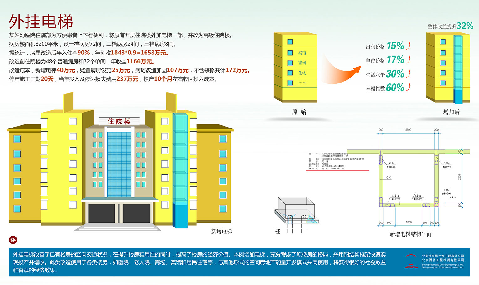 外挂电梯改善了已有楼房的竖向交通状况,在提升楼房实用性的同时,提高了楼房的经济价值,本例增加电梯,充分考虑了原楼房的格局,采用钢结构框架快速实现投产并增收,此类改造使用于各类楼房,如医院、老人院、商场、宾馆和居民住宅等,与其他形式的空间房地产能量开发模式共同使用,将获得很好的社会效益和客观的经济效果。